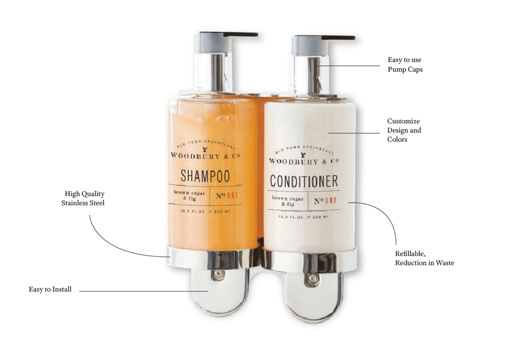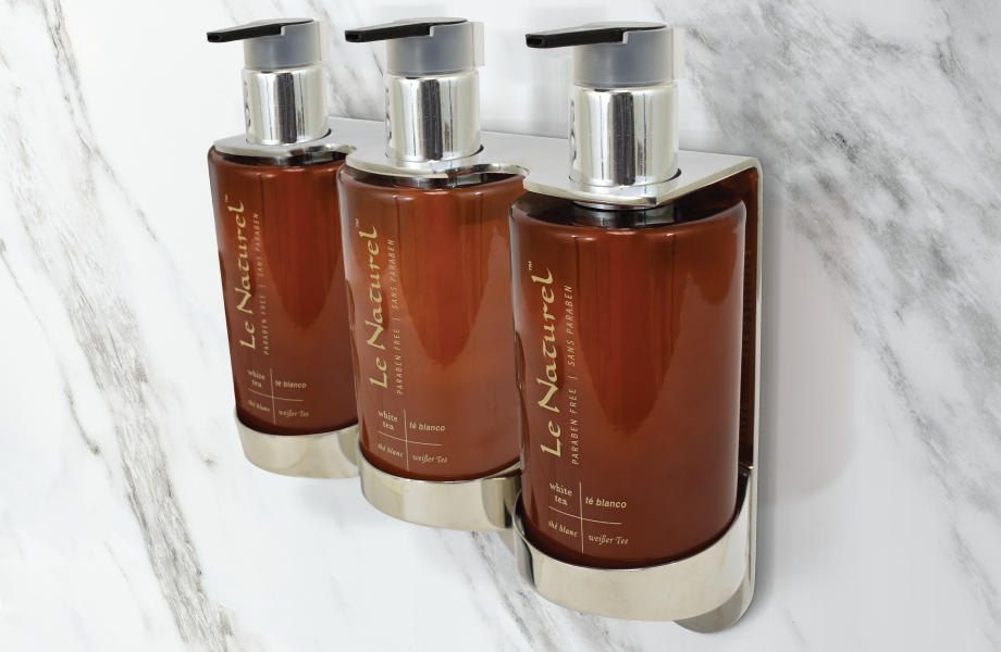 A steel frame provides a sturdy and tamper-proof sanitary option that only housekeeping could unlock with a special key. The standard wall bracket dispenser is fully customizable and easily refillable.