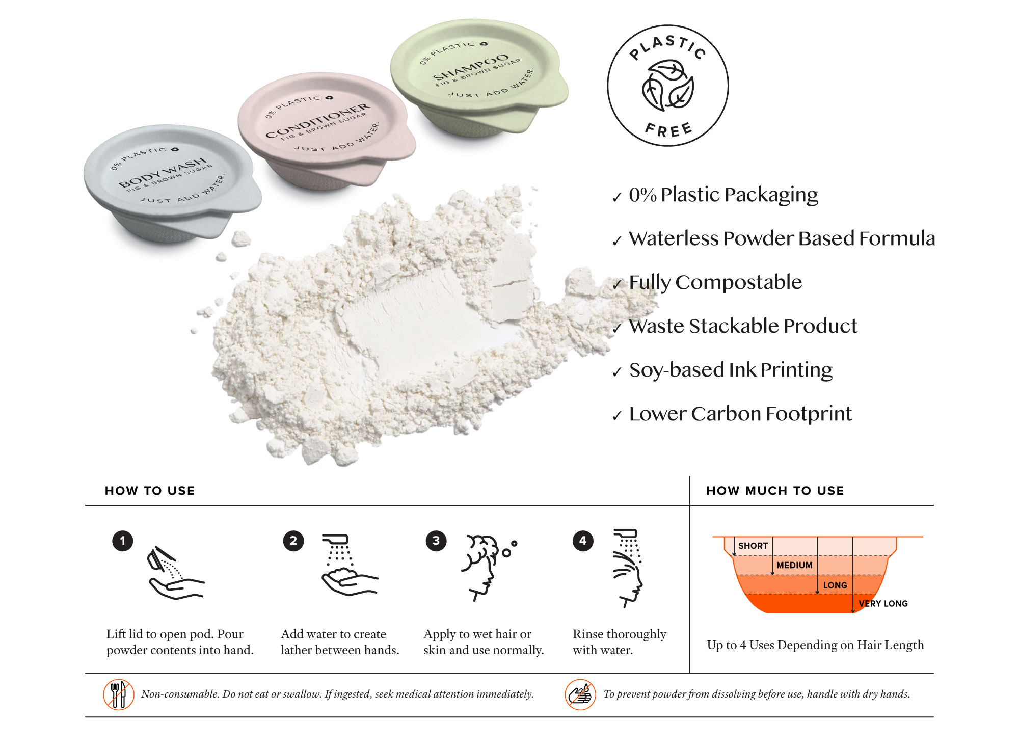 The EcoPod is a revolutionary alternative to traditional single use amenities. As a sustainable solution to plastic packaging and heavy liquid formulations, the EcoPod uses a waterless powder based formula packaged in paper pods made with 60% bamboo fiber, 30% sugarcane, and 10% wood fiber. Shipping such a lightweight powder product also lowers our global carbon footprint. Easy to use, easy to transport, and even easy to compost, we are pioneering a new road to zero plastic future.